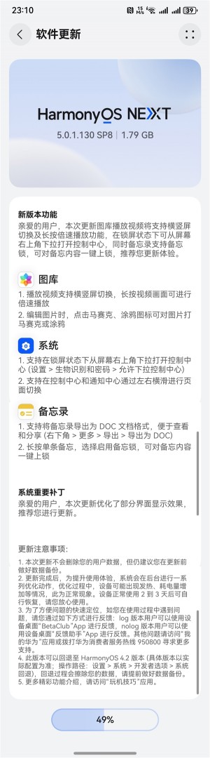6月20日消息,日前,华为开启鸿蒙 HarmonyOS NEXT 5.0.1.130 SP8版本大规模升级推送。