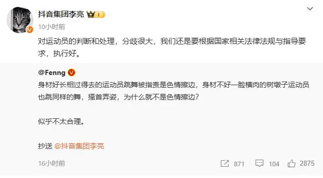 有微博网友称,“身材好长相过得去的运动员跳舞被指责是色情擦边,身材不好一脸横肉的树墩子运动员也跳同样的舞,搔首弄姿,为什么就不是色情擦边?似乎不太合理。”并@抖音集团李亮。