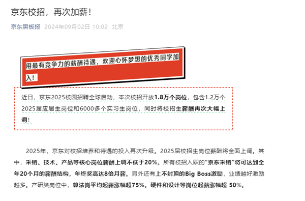 9月2日消息,今天京东集团宣布,公司对2025年校园招聘的薪资待遇进行了大幅上调。