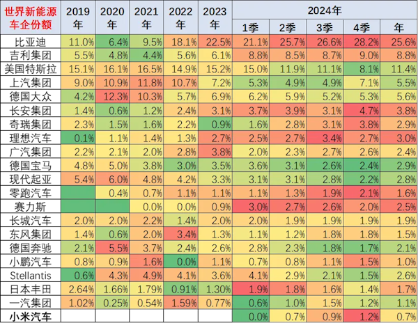 相比之下,比亚迪的表现则十分亮眼。2021年,比亚迪的市场份额为9.5%,而到了2024年第四季度,这一数字已经飙升至28.2%,增长了两倍之多!