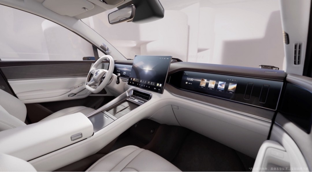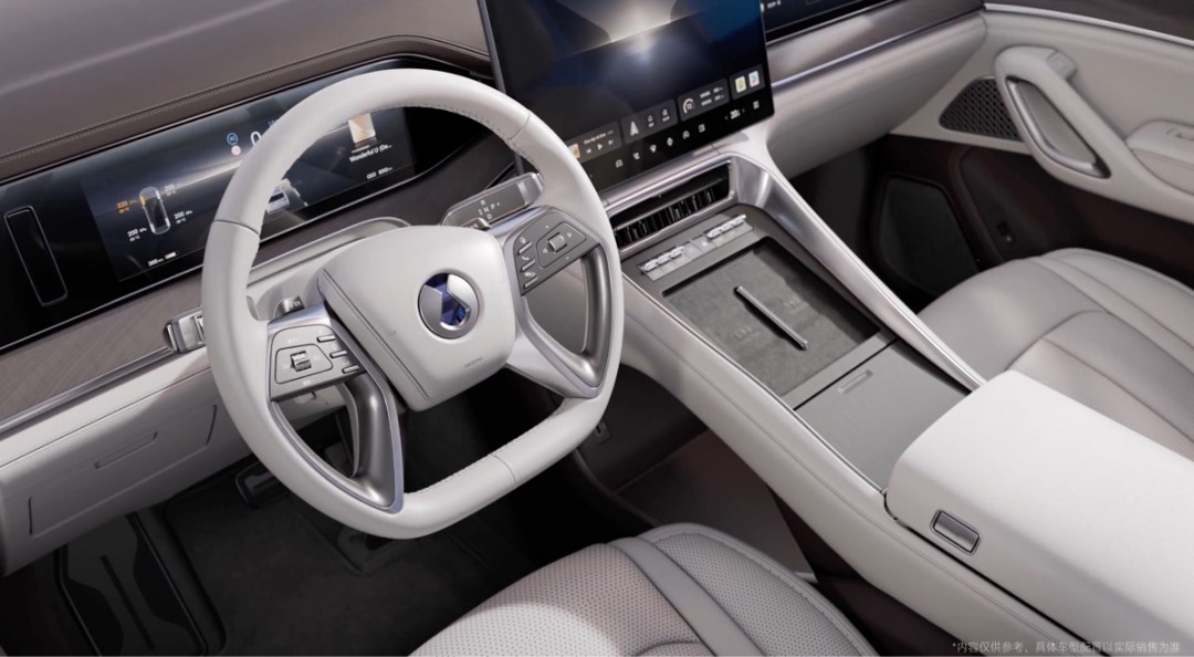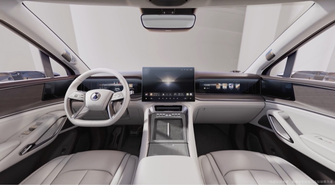 新车内饰采用了家族设计语言,和腾势Z9同款,采用了对称设计,前排搭载了包括17.3英寸悬浮中控屏、液晶仪表和副驾娱乐屏在内的三块大屏,同时采用四辐式方向盘。