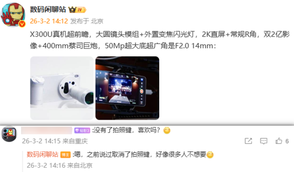据知名数码博主@数码闲聊站 最新发布的信息显示,与此前曝光的消息基本一致,全新的vivo X300 Ultra将采用大圆镜头模组搭配外置变焦闪光灯的设计,并将采用2K直屏+常规R角。其中影像系统无疑是该机最大的亮点。它将搭载双2亿像素镜头和5000万像素超广角镜头,并配有400mm蔡司增距镜,能够为用户带来更远、更清晰的拍摄体验。此外,该博主还进一步透露,vivo X300 Ultra取消了拍照键,原因是很多用户表示不想要。