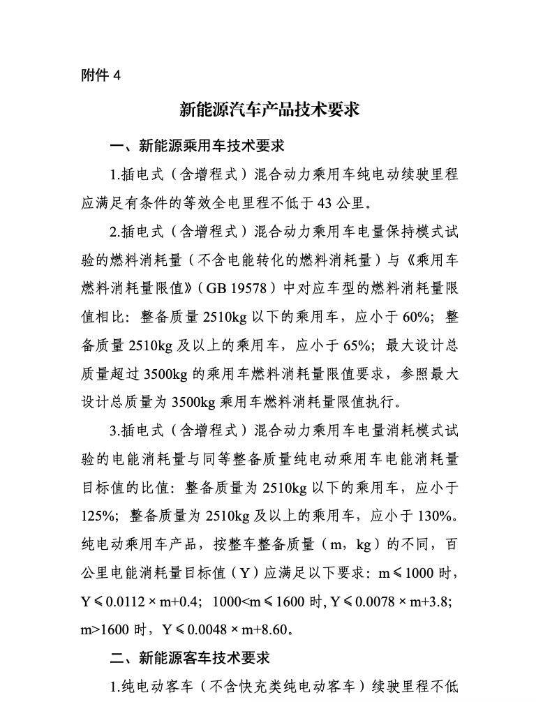 插电式混合动力(含增程式)客车纯电续驶里程不低于50公里,插电式混合动力货车(含增程式)纯电续驶里程不低于50公里,1、插电式(含增程式)混合动力乘用车纯电动续驶里程应满足有条件的等效全电里程不低于43公里。