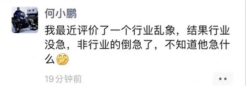 11月4日晚,何小鹏在朋友圈回应称:“我最近评价了一个行业乱象,结果行业没急,非行业的倒急了,不知道他急什么。”