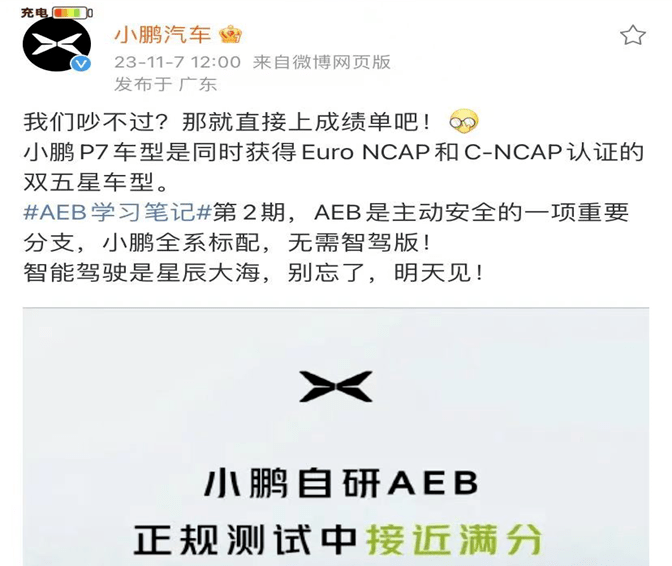11月6日上午,小鹏汽车官方微博号发布题为“AEB很重要,但AEB测试不等于营销炒作”的长图,介绍了车企研究AEB的历史和AEB的测试项目,疑似回应余承东对何小鹏“不懂AEB”的质疑,并用“营销炒作”内涵问界。