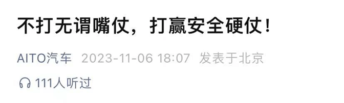 同天下午,问界官方微信公众号“AITO汽车”发布题为“不打无谓嘴仗,打赢安全硬仗”的文章,介绍了问界智驾车型AEB的技术优势,并在文章结尾着重标出“问界智驾版AEB的‘遥遥领先’,不但有大量车主‘民间小视频’的真实体验,更有800+门店的试驾车,随时等候您的试驾”,疑似对“炒作”进行回应。