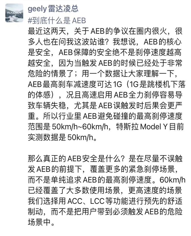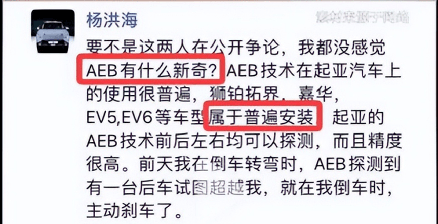 起亚中国首席运营官杨洪海在朋友圈表示:“要不是这两人在公开争论,我都没感觉AEB有什么新奇?”