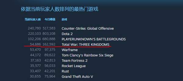 此外,根据Steam的统计数据,目前《三国:全面战争》的最高同时在线玩家数量已经突破了16万人,仅次于《Dota2》《绝地求生》和《CS:GO》,而这也是全战系列的最佳首发成绩。作为对比,《战锤:全面战争》的同时在线峰值为11.2万人,《罗马2:全面战争》的同时在线峰值为11.8万人。