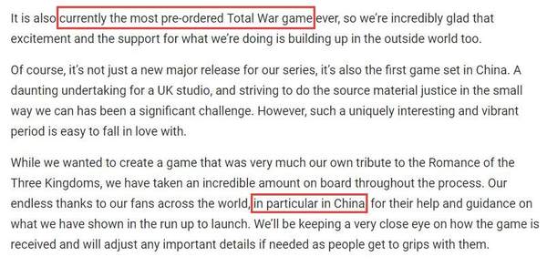在最近的博客中,Creative Assembly还表示《三国:全面战争》已经成为了全战系列预售销量最高的作品,官方感谢了全球各地的粉丝,其中还特别致谢中国玩家对游戏的支持。