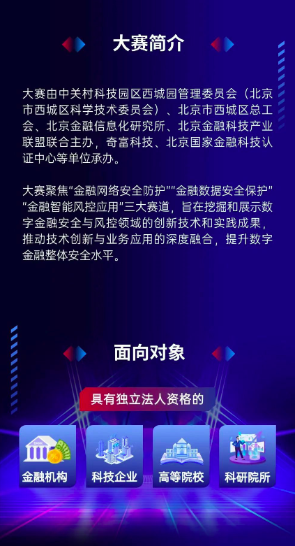 【TechWeb】2月11日消息,由中关村科技园区西城园管理委员会(北京市西城区科学技术委员会)、北京市西城区总工会、北京金融信息化研究所、北京金融科技产业联盟联合主办的“数字金融安全创新与实践大赛”拉开帷幕,诚邀各界踊跃报名参赛。