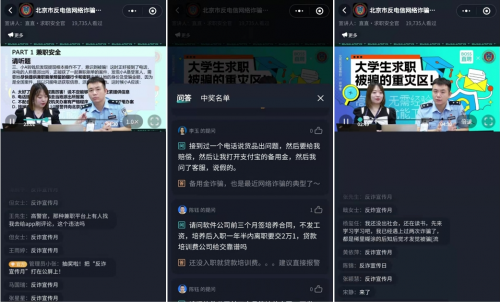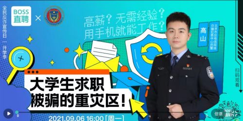 BOSS直聘求职安全官表示,“大学生求职安全保障是招聘平台安全工作的重点,直播间是近年来反诈防骗的新兴阵地。北京市反电信网络诈骗犯罪中心民警入驻招聘平台直播,在受众精准度、形式与反诈科普效果上都做到了兼顾,本次直播也是近期BOSS直聘反诈骗宣传关注度最高的活动之一。”
