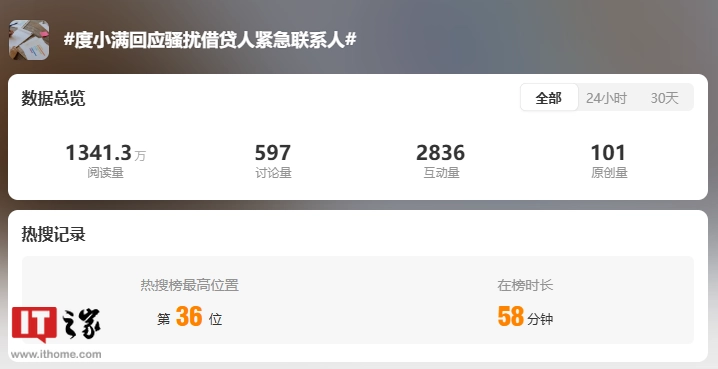 此外,#女明星成度小满贷款紧急联系人##度小满回应骚扰借贷人紧急联系人#等词条这几天也接连登上社交平台热搜,阅读量超 3000 万,上万条投诉指向其短信轰炸、电话骚扰等催收行为。律师称,平台此举涉嫌违法,被侵权人可向相关部门举报或提起诉讼。