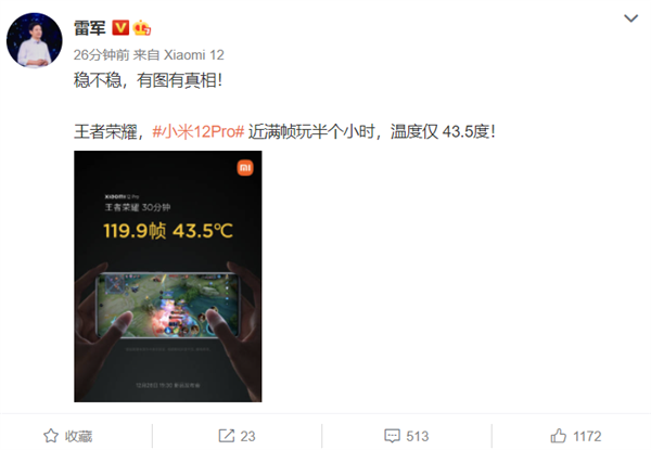 小米12 Pro近满帧《王者荣耀》玩半个小时最高43.5度 雷军:有图有真相快讯