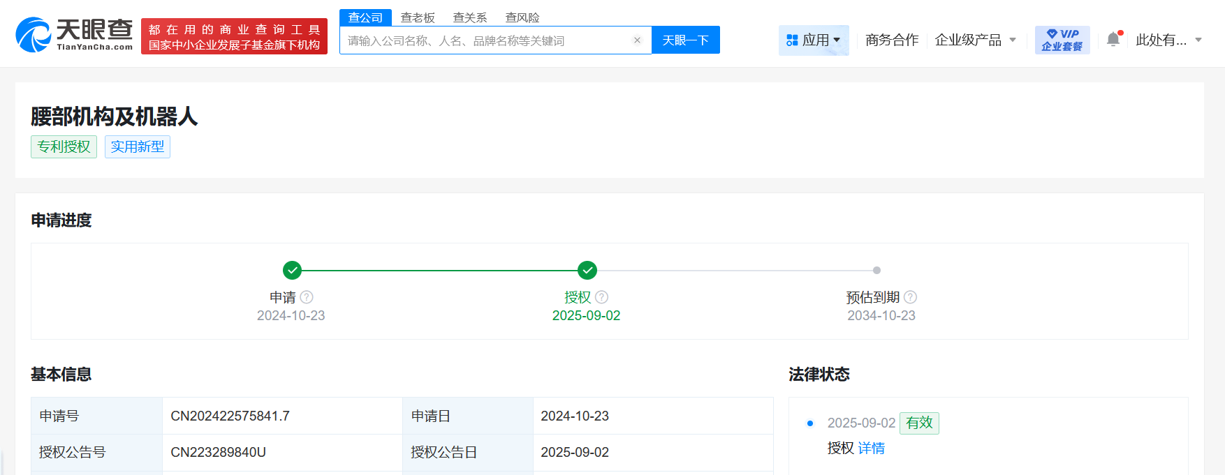 天眼查App显示,近日,广州小鹏汽车科技有限公司申请的“腰部机构及机器人”专利获授权。