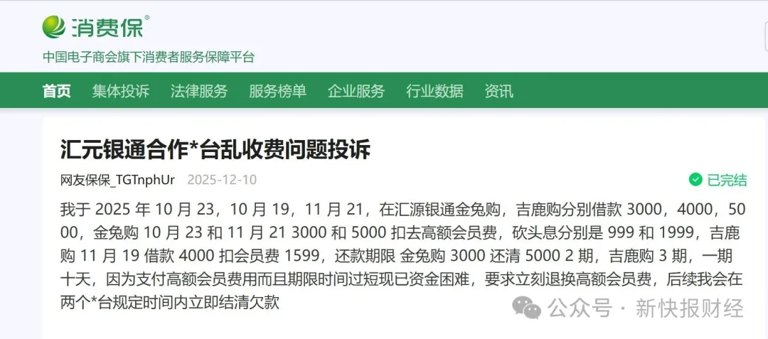 有借款人表示,其于2025年10月先后在金兔购、吉鹿购借款3000元、4000元、5000元,其中,金兔购收取高额会员费999元、1999元,吉鹿购收取会员费1599元,这些平台与汇元银通合作收取上述费用。