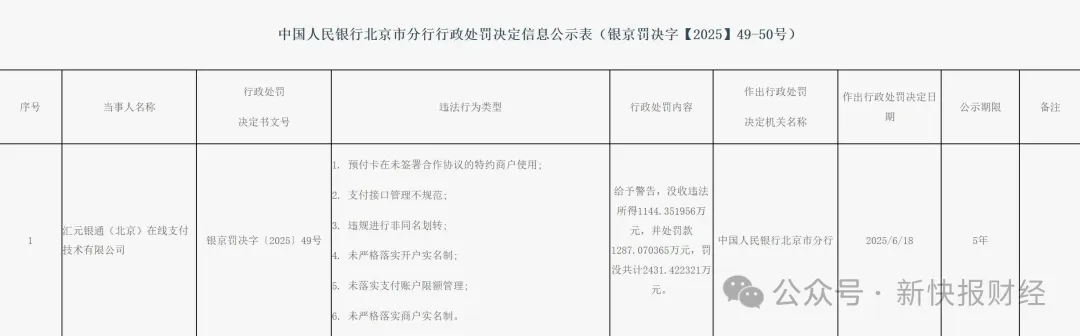 据公开信息,2025年6月,中国人民银行北京市分行披露汇元银通的行政处罚决定信息。汇元银通(北京)在线支付技术有限公司因涉及预付卡在未签署合作协议的特约商户使用,支付接口管理不规范,未严格落实开户实名制,未落实支付账户限额管理,未严格落实商户实名制等六项违法行为,被监管给予警告,没收违法所得1144.351956万元,并处罚款1287.070365万元。