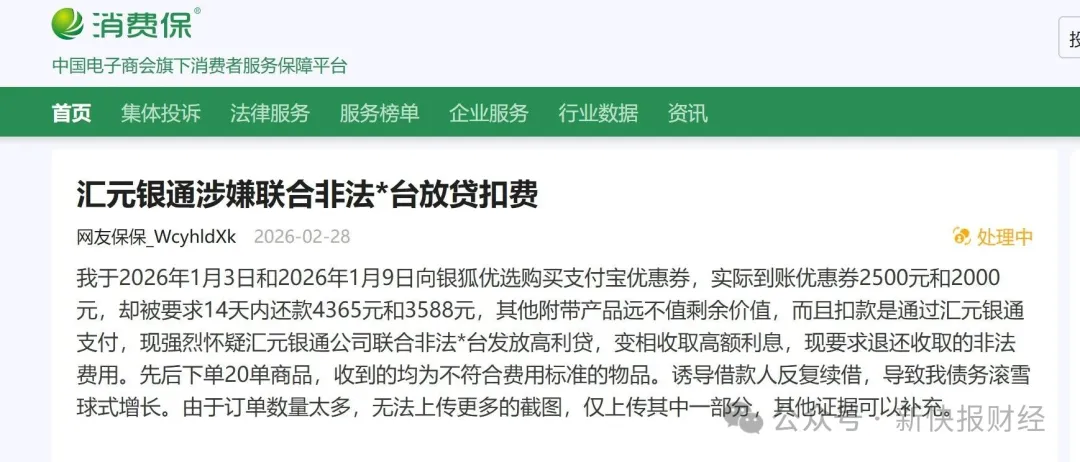 此外,还有银狐优选等与汇元银通关联的分期平台被投诉。比如,一位借款人投诉称,其在2026年1月3日、2026年1月9日向银狐优选购买支付优惠券,实际到账优惠券2500元、2000元,却被要求14天内还款4365元、3588元。上述分期费用是通过汇元银通支付扣款。