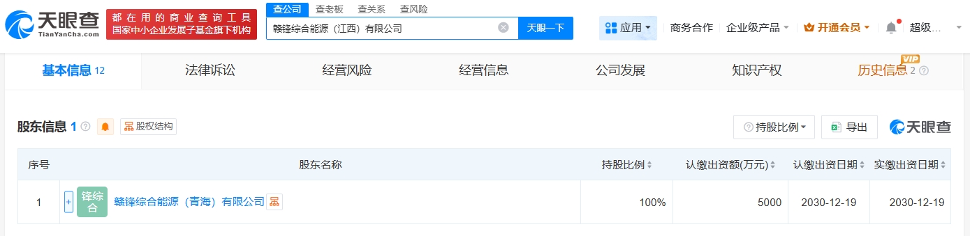 天眼查App显示,近日,赣锋综合能源(江西)有限公司成立,法定代表人为黄腾飞,注册资本5000万人民币,经营范围包括储能技术服务、新兴能源技术研发、在线能源监测技术研发、能量回收系统研发等。股东信息显示,该公司由赣锋锂业旗下赣锋综合能源(青海)有限公司全资持股。