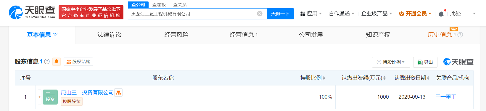 天眼查App显示,近日,黑龙江三晟工程机械有限公司成立,法定代表人为贺鑫,注册资本1000万人民币,经营范围含建设工程施工、建筑劳务分包、保险代理业务、建设工程设计、道路货物运输、机械设备销售、建筑工程用机械销售、机械设备租赁等。股东信息显示,该公司由三一重工(600031)旗下昆山三一投资有限公司全资持股。