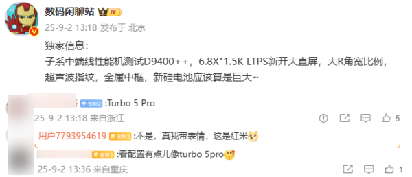 疑似REDMI Turbo 5 Pro参数配置曝光:搭载天玑9400++旗舰芯快讯