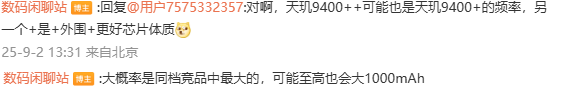 据知名数码博主@数码闲聊站 最新发布的信息显示,一款子系中端性能机正在测试联发科天玑9400++处理器,采用6.8英寸左右的1.5K LTPS大直屏和大R角宽比例设计。还将内置容量巨大的新硅电池,拥有金属中框和超声波指纹。结合此前相关爆料,该机很可能就是即将与大家见面的全新REDMI Turbo 5 Pro。据该博主透露,天玑9400++处理器可能是天玑9400+同款频率,另一个“+”代表外围配置优化等。此外,新机的电池大概率是同档竞品中最大,可能至高会大1000mAh,有望接近10000mAh。