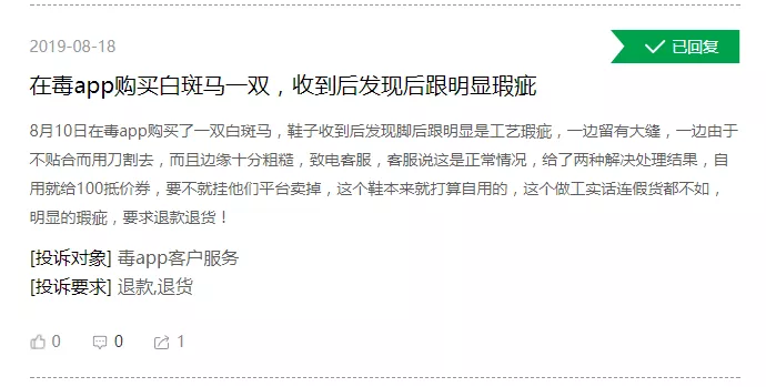 其中在投诉榜中更是有许多用户直呼在平台上购买的鞋子是假货,一名男士在8月10号在平台上购买了一双白斑马,收到货后鞋子明显有工艺瑕疵,边缘粗糙怀疑不是正品。