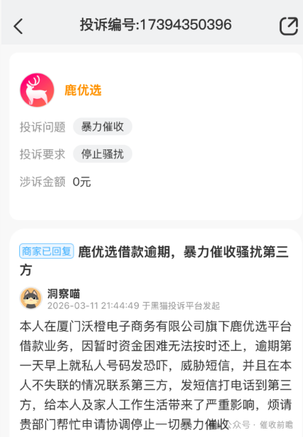 一边是商城售卖商品价格远超市场价,承诺的七天无理由退换货沦为空谈,消费者维权无门;一边是借款业务逾期即遭遇暴力催收,私人号码恐吓、无故骚扰第三方,借款人生活受严重影响。2026 年 3 月 11 日,黑猫投诉平台短时间内接连出现两起针对厦门沃橙电子商务有限公司旗下鹿优选平台的投诉,涉事金额从 0 元到 7994 元不等,暴露出该平台在消费服务与金融业务双重板块的多重合规问题。成立仅两年的沃橙电商,为何旗下平台接连触碰行业红线,消费与金融领域的双重乱象,更让其合规运营的能力与态度备受质疑。