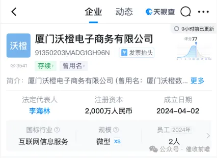 工商信息显示,厦门沃橙电子商务有限公司成立于 2024 年 4 月 2 日,法定代表人为李海林,注册资本 2000 万人民币,2024 年员工规模仅 2 人,属于微型企业,其国标行业包含互联网信息服务,曾有过名称变更记录,当前企业状态为存续,天眼查评分为 77 分。就是这样一家规模极小的互联网信息服务企业,旗下鹿优选平台却同时布局了电商消费与借款金融两大业务板块,业务布局与企业规模的严重不匹配,似乎为其后续的各类投诉问题埋下了伏笔。