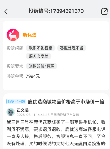 此次引发关注的两起投诉,直指鹿优选平台两大核心业务的致命问题。3 月 11 日 14 时 41 分,有消费者在黑猫投诉平台反映,其于 3 月 3 日在鹿优选商城花费 7994 元购买了一部苹果 16 手机,收货后因不满意提出退货退款,却遭遇了客服失联的窘境 —— 客服电话无人接听,售后服务的线上消息也始终无人回复。该消费者表示,购买时平台明确标注支持七天无理由退换货,可真正想要行使合法权益时,却发现售后服务形同虚设,且商城内该款手机价格较市场价高出一倍,高溢价消费再加上虚假的售后承诺,让其蒙受了经济损失与维权困扰。