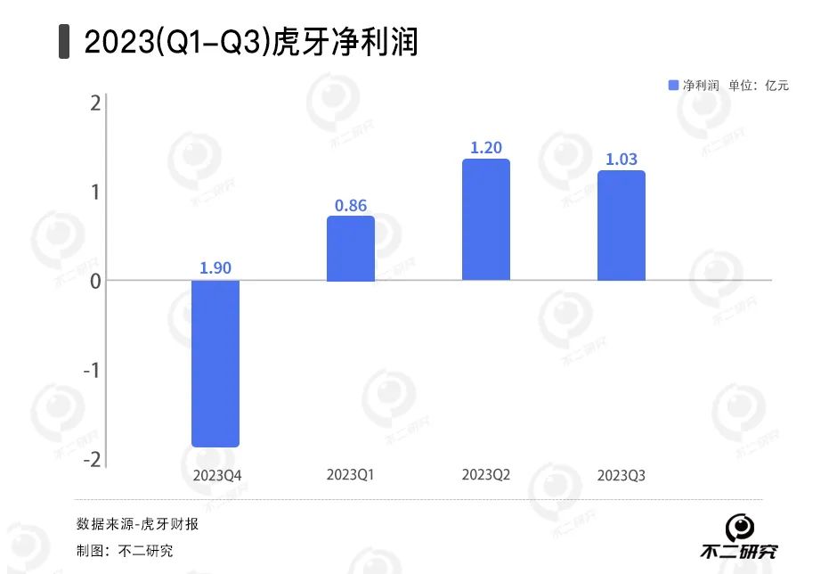 虎牙并不是每个季度都是盈利状态。在非美国通用会计准则下,虎牙2023年四季度净亏损1.9亿元,2023年Q1-Q3,虎牙净利润分别是8550万元、1.2亿元、1.03亿元。