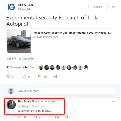 尽管如此,特斯拉公司CEO埃隆•马斯克还是对这一研究表示了称赞。科恩研究室3月28日在推特上发布了此次研究的结果后,马斯克1日在评论区回复称:“科恩研究室干得一如既往的漂亮”。