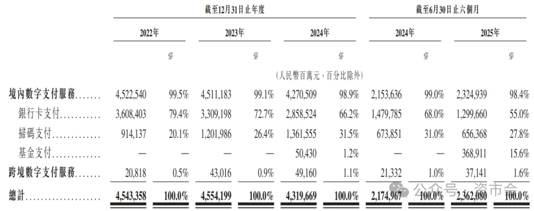 拉卡拉的跨境数字支付服务收入更少,2022年至2024年及2025年前6月分别为2081.8万元、4301.6万元、4916万元、3714.1万元,占比分别是0.5%、0.9%、1.1%、1.6%。