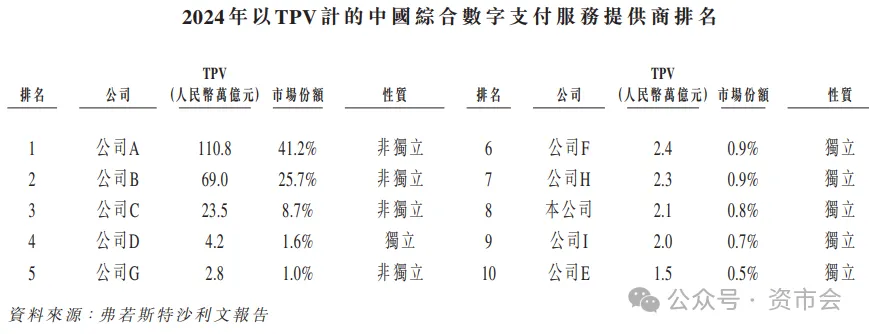 根据弗若斯特沙利文的资料,2024年中国综合数字支付服务市场的TPV为268.6万亿元,三大头部平台合共占据75.6%的市场份额;这年中国聚合收单市场的TPV为108.9万亿元,三大头部平台合计市场占有率约67.5%。