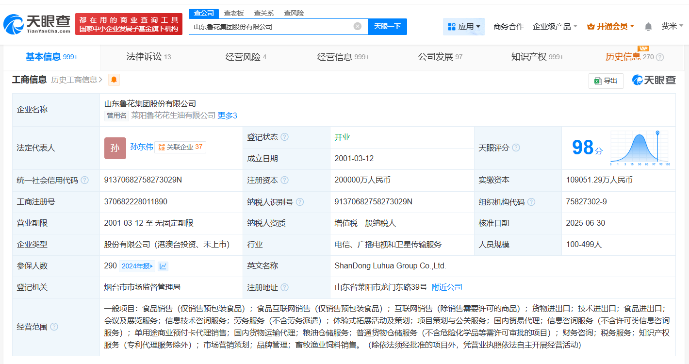 天眼查App显示,近日,山东鲁花集团有限公司发生工商变更,企业名称变更为山东鲁花集团股份有限公司,注册资本由约10.9亿人民币增至20亿人民币,增幅约83%,同时部分高管发生变更。