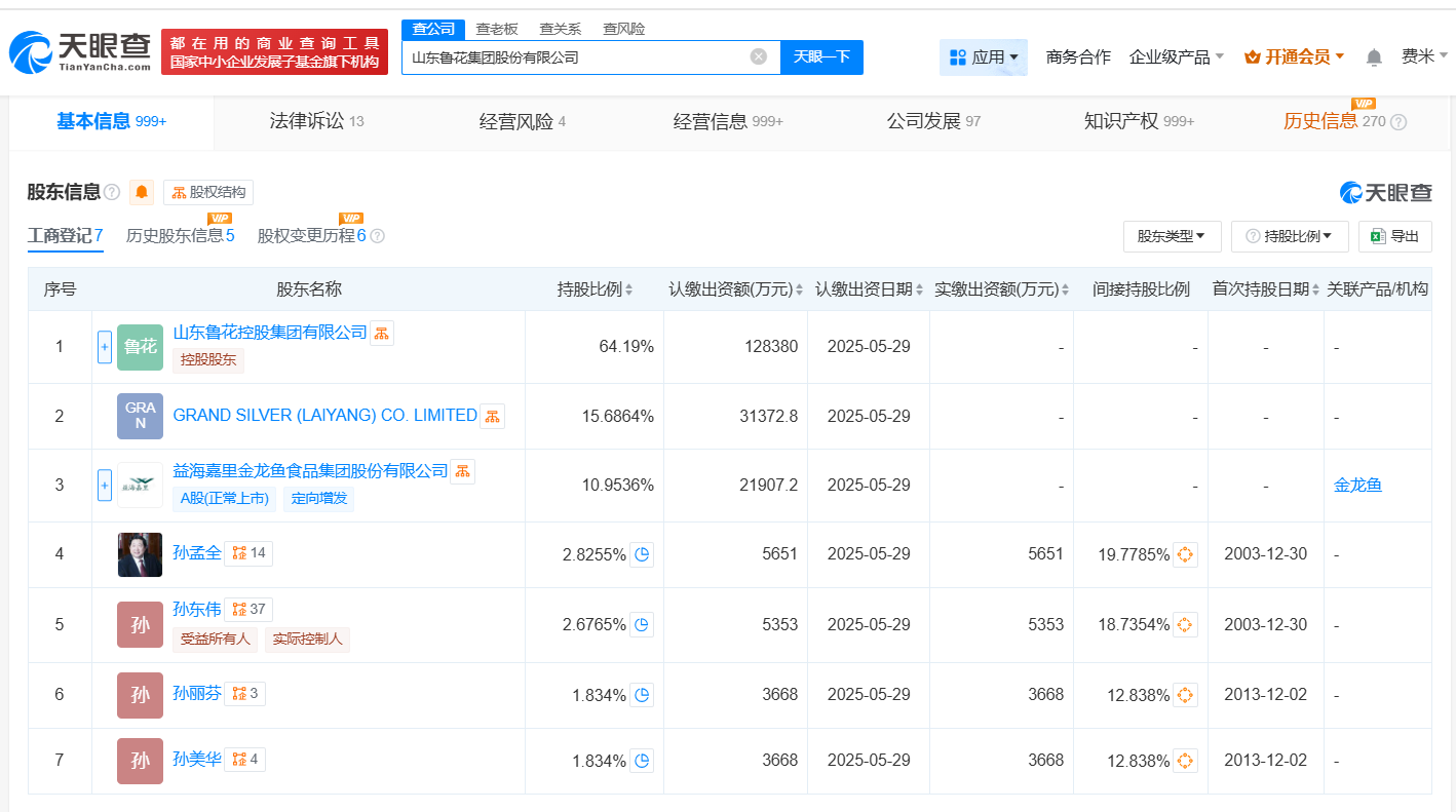 该公司成立于2001年3月,法定代表人为孙东伟,经营范围包括食品销售、食品互联网销售、货物进出口等,由山东鲁花控股集团有限公司、GRAND SILVER (LAIYANG) CO. LIMITED、金龙鱼(300999)等共同持股。