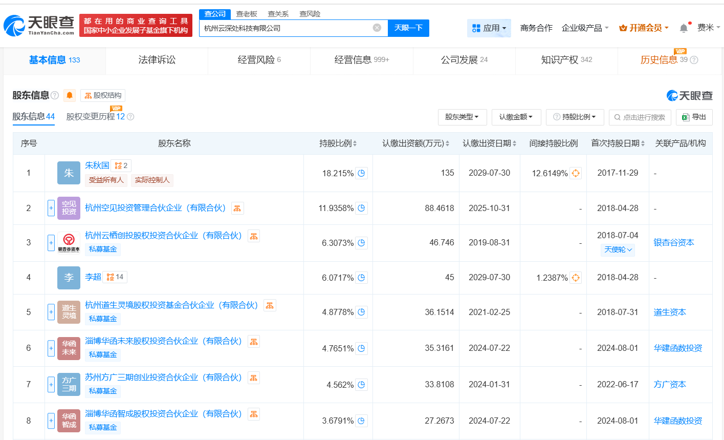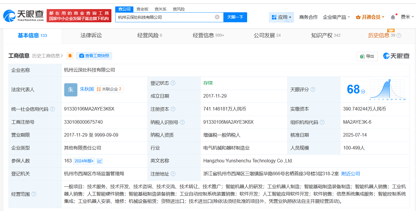 该公司成立于2017年11月,法定代表人为朱秋国,经营范围包括智能机器人的研发、工业机器人制造、智能基础制造装备制造等,现由朱秋国、杭州空见投资管理合伙企业(有限合伙)及上述新增股东等共同持股。官网显示,该公司在中国率先实现四足机器人全自主巡检变电站。