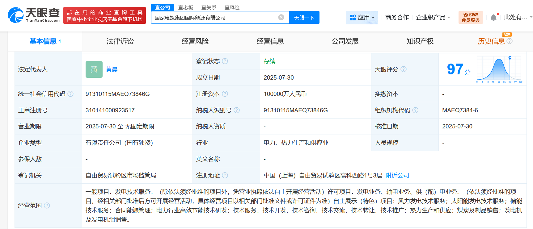 天眼查App显示,7月30日,国家电投集团国际能源有限公司成立,法定代表人为黄晨,注册资本10亿人民币,经营范围含发电技术服务,发电业务、输电业务、供(配)电业务,太阳能发电技术服务,储能技术服务,合同能源管理等。股东信息显示,该公司由国家电力投资集团有限公司全资持股。