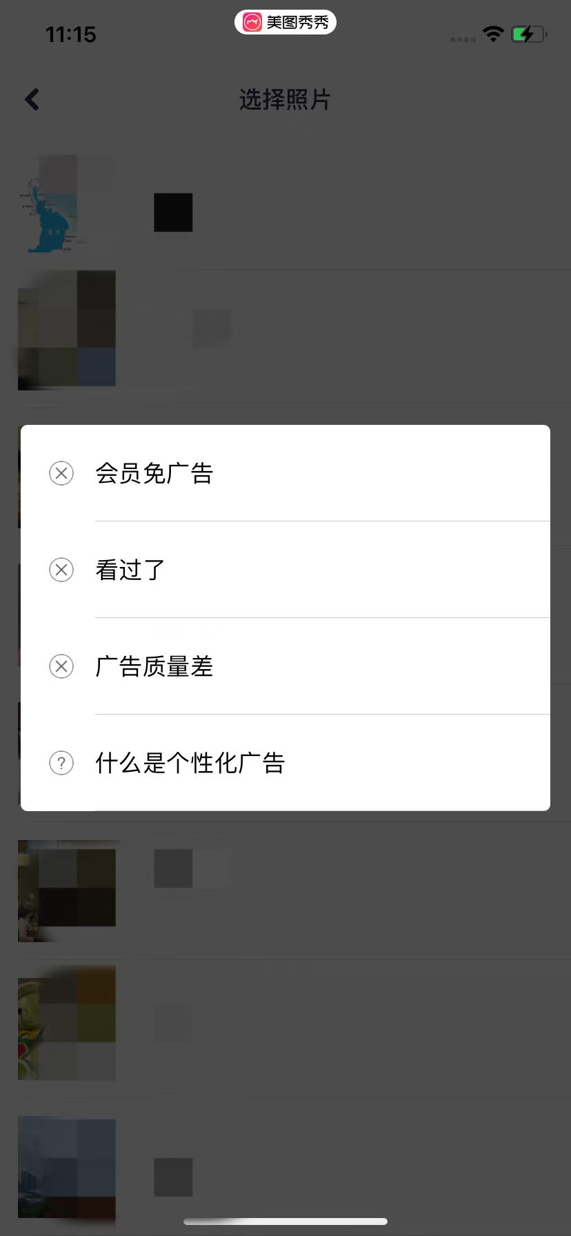 关闭广告后,系统弹出的二级菜单。美图秀秀APP截图
