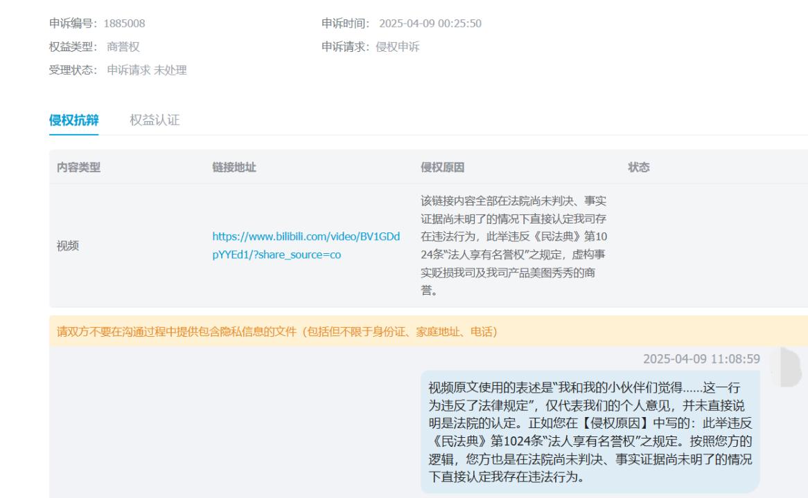 4月8日,团队将此次诉讼经历制作成视频分享至哔哩哔哩平台,却遭美图秀秀以“侵害法人名誉权”为由投诉。投诉方称,该视频在法院尚未判决的情况下直接认定其存在违法行为,虚构事实,贬损其商誉。经平台审核,该投诉因“证据不足”被驳回,相关视频目前仍可正常观看。
