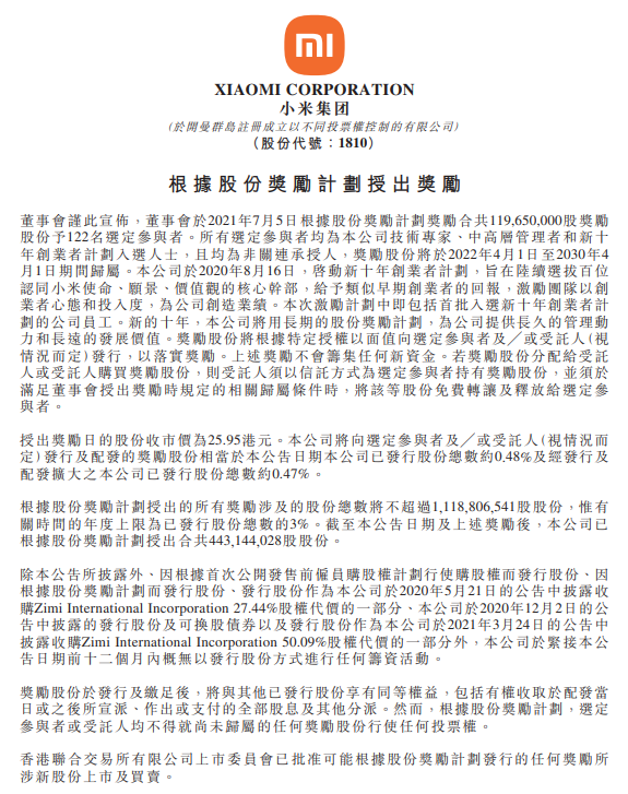 小米激励技术专家和核心管理者 122人获1.2亿股十年股权激励快报