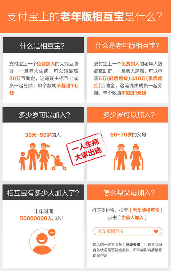 “我们的相互宝已经有超过5000万人加入,通过互助的形式为36位重疾成员提供了帮助,但主要面向30天-59周岁年龄段的用户“,蚂蚁金服副总裁尹铭介绍,为了让更多用户获得普惠保障,因此上线“老年版相互宝”,为有大病保障需求的老年人提供互帮互助的平台。
