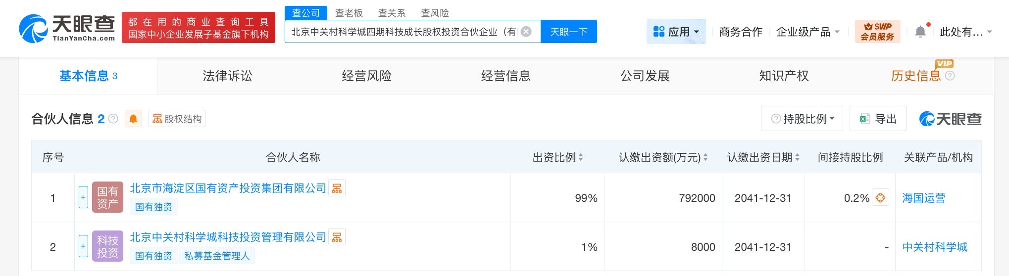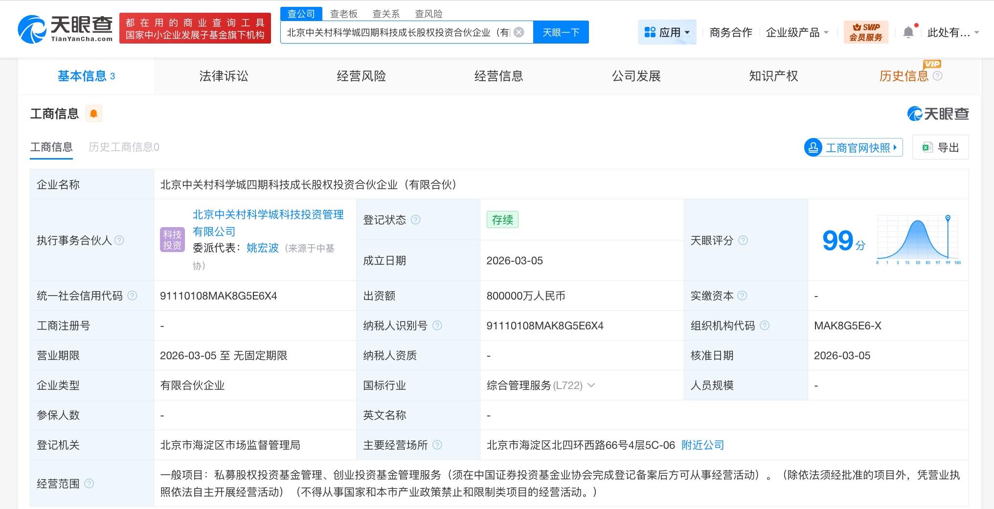 天眼查工商信息显示,近日,北京中关村科学城四期科技成长股权投资合伙企业(有限合伙)成立,执行事务合伙人为北京中关村科学城科技投资管理有限公司,出资额80亿人民币,经营范围为私募股权投资基金管理、创业投资基金管理服务。合伙人信息显示,该合伙企业由北京市海淀区国有资产投资集团有限公司、北京中关村科学城科技投资管理有限公司共同出资。