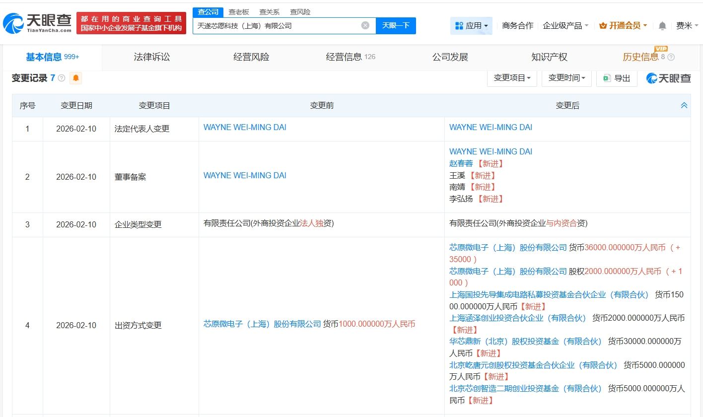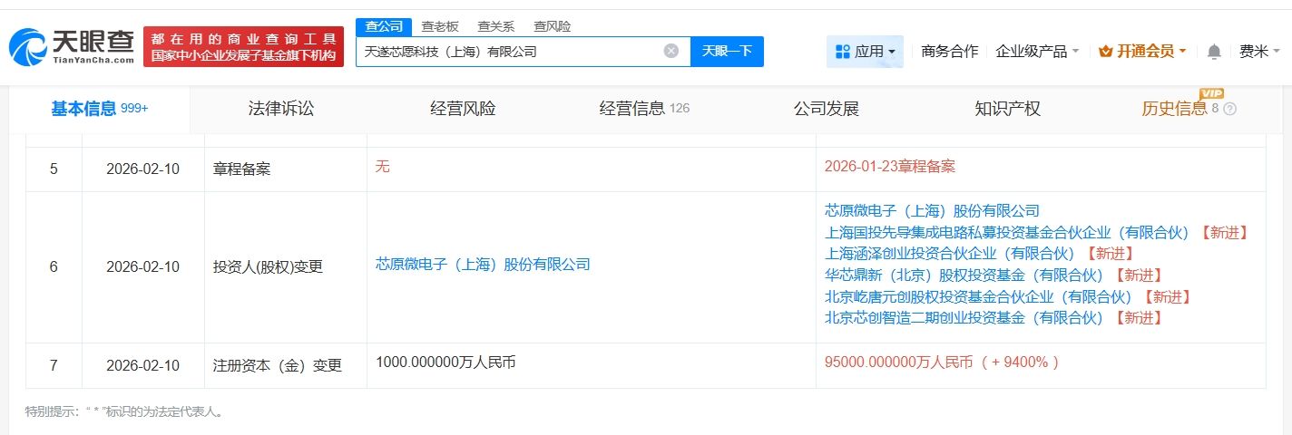 天眼查App显示,近日,天遂芯愿科技(上海)有限公司发生工商变更,新增国家大基金三期旗下华芯鼎新(北京)股权投资基金(有限合伙)、上海国投先导集成电路私募投资基金合伙企业(有限合伙)等为股东,同时,注册资本由1000万人民币增至9.5亿人民币,增幅9400%。