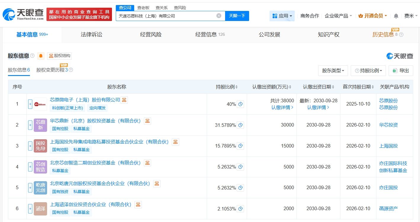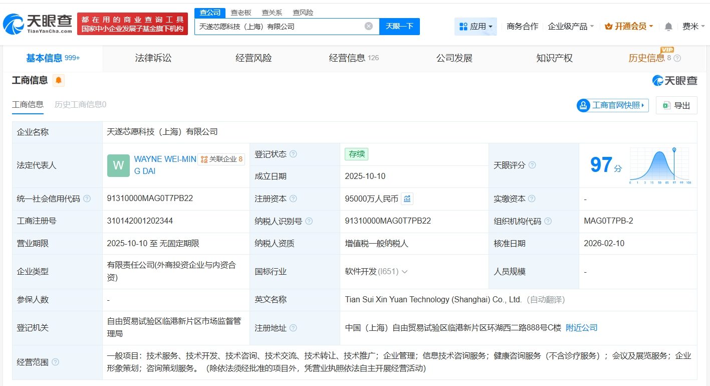天遂芯愿科技(上海)有限公司成立于去年10月,法定代表人为WAYNE WEI-MING DAI,经营范围包括企业管理、信息技术咨询服务、健康咨询服务等。股东信息显示,该公司现由芯原股份(688521)及上述新增股东共同持股。