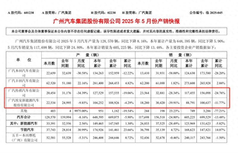 6月6日晚,广汽集团发布新产销快报显示,5月份,广汽集团完成销量11.7万辆,同比大幅下滑24.8%;1-5月,广汽集团累计销量仅为60.5万辆,还同比下滑13.48%;数据中,作为合资品牌的广汽丰田,成为广汽集团单月以及年内唯一同比增长的品牌;而另一合资广汽本田单月销量暴跌58%,年内则大幅下滑28%;