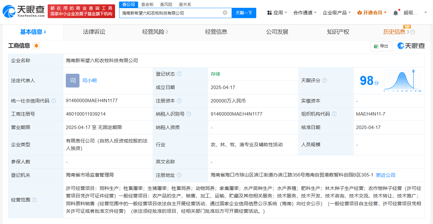 近日,海南新希望六和农牧科技有限公司成立,法定代表人为司小明,注册资本20亿人民币,经营范围包括饲料生产、牲畜饲养、农作物种子经营等。