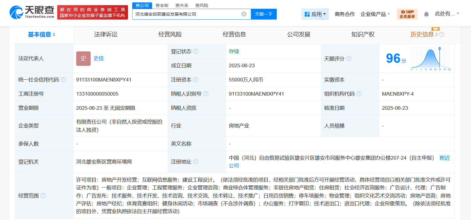 近日,河北雄安启辰建设发展有限公司成立,法定代表人为史佳,注册资本5.5亿人民币,经营范围含房地产开发经营、互联网信息服务、建设工程设计、企业管理、工程管理服务、企业管理咨询、商业综合体管理服务等。