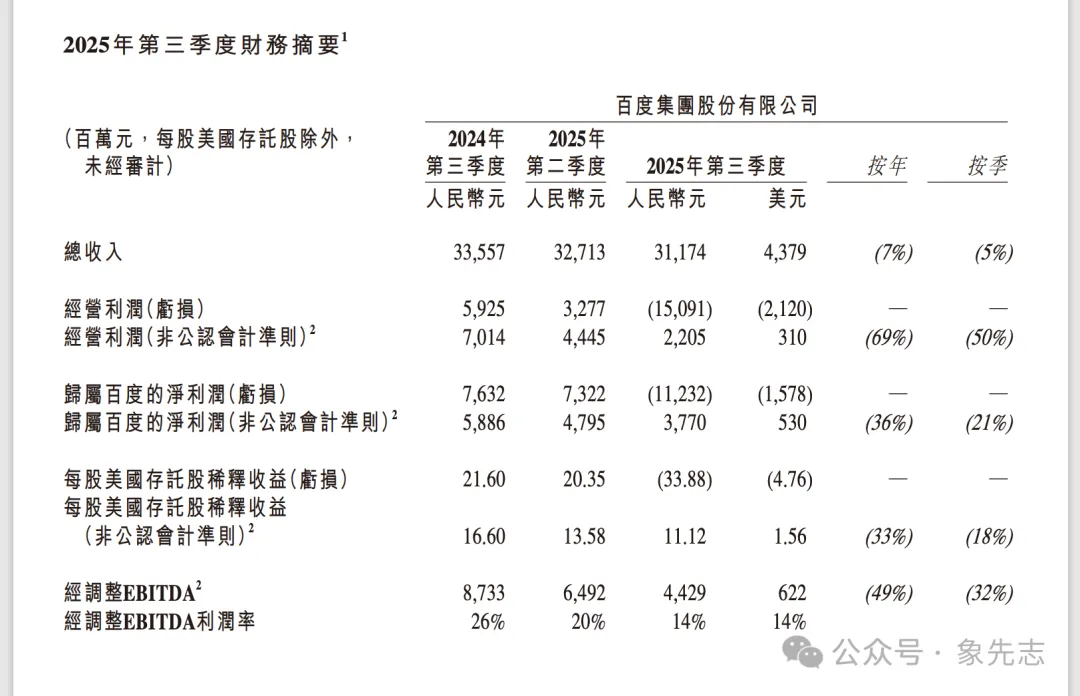 然后是营收整体下滑,从 2025 年第二季度开始营收同比下滑 4%,第三季度同比下滑 7%,截至三季度已连续 2 个季度营收同比下降。其实2024 年四季度百度营收就已同比减少 2%,只是 2025 年一季度曾微增 3%,未形成连续下滑趋势。