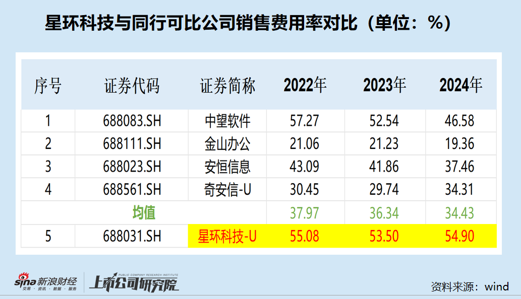 同行可比公司中,2022-2024年,奇安信-U的销售费用率分别为30.45%、29.74%、34.31%;安恒信息的销售费用率为43.09%、41.86%、37.46% ;中望软件的销售费用率分别为57.27%、52.54%、46.58 %;金山办公的销售费用率分别为21.06%、21.23%、19.36%;四家可比公司的均值分别为37.97%、36.34%、34.43%,明显低于星环科技的55%左右。
