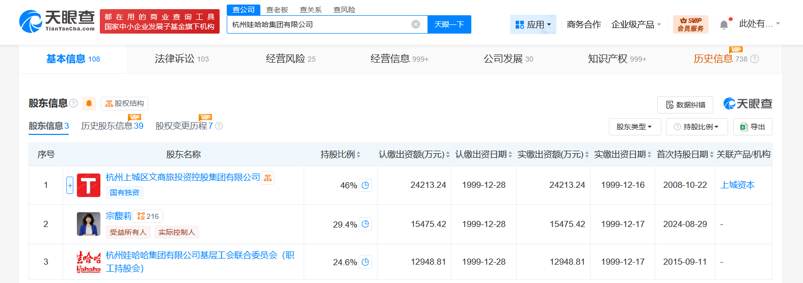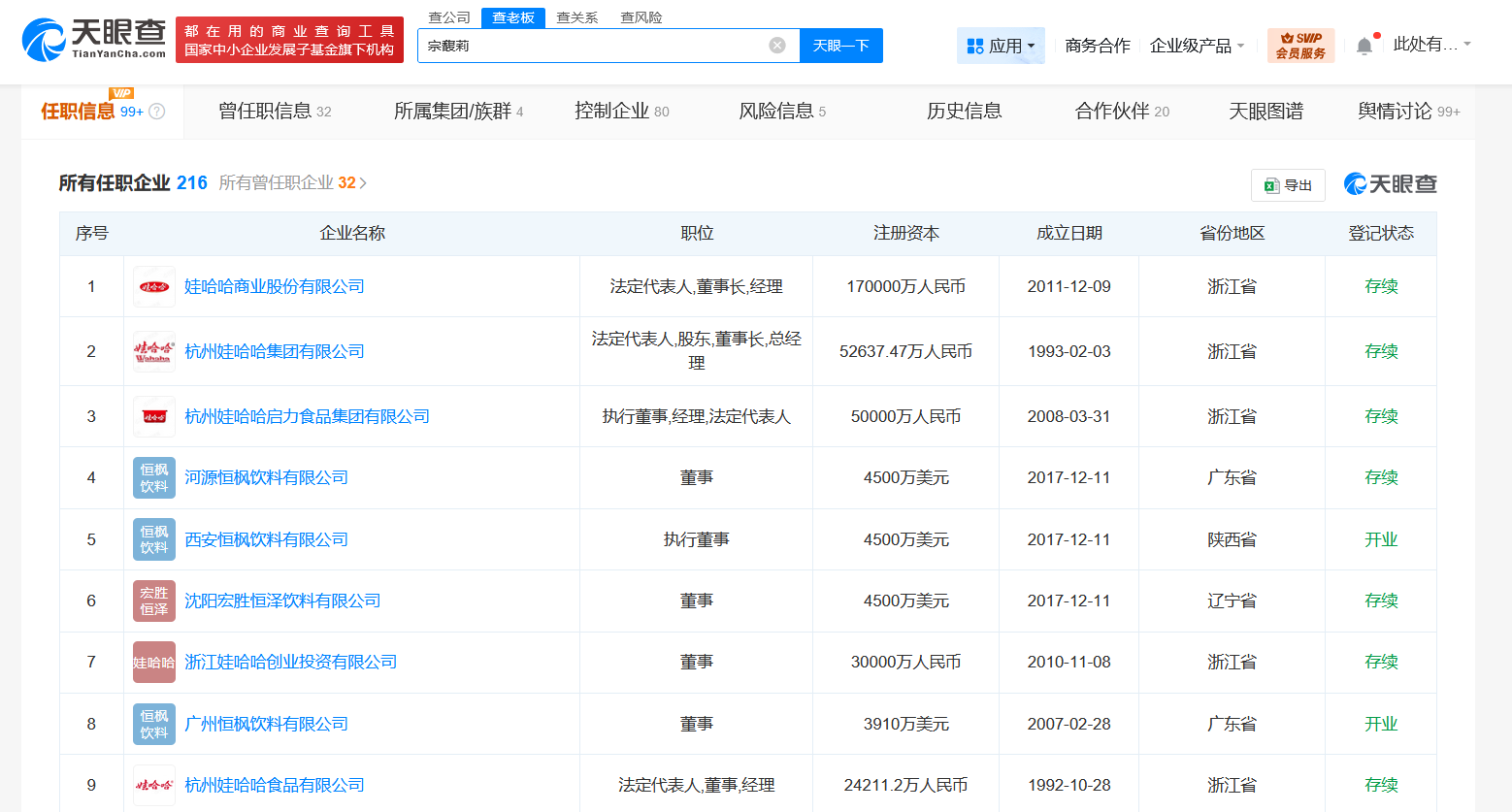 天眼查App显示,宗馥莉名下关联210余家企业,其中200余家为存续或开业状态,任职信息显示,宗馥莉在上述企业中担任董事长、总经理等职务,并持有10余家企业股份。自父亲去世后,宗馥莉已接手包括杭州娃哈哈集团有限公司、娃哈哈商业股份有限公司、杭州娃哈哈启力食品集团有限公司等多家公司。目前,宗馥莉已于去年8月接手父亲名下杭州娃哈哈集团有限公司股份,成为该公司第二大股东,持股29.4%。